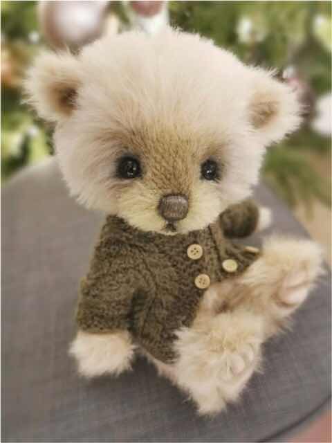I have just finished an extremely 11 inch pretty boy bear. He’s called Tiny Tim. He’s made from hand dyed Schulte mohair and has wool felt paw pads.